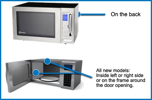 • Microwave: The tag is usually where the door shuts, or sometimes on the left wall inside the microwave on over the range units. On countertop models, this tag may be on the back side of the microwave instead.