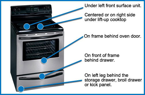 • Freestanding Range: Usually you have to remove or open the bottom drawer, and the tag is on one of the legs that is normally covered by the drawer. Exception: On Maytag Gemini Freestanding Double Ovens, there is a flag similar to on a mailbox located on the upper rear of the control panel that lifts up to give you the model and serial number.